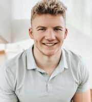 A person wearing a bright red industrial jacket with reflective stripes and a white safety helmet. They are holding a book titled 'Occupational Safety and Health Act' against a plain blue background. The person is smiling and the jacket has a logo on the chest.